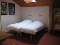 Double bed and bunk beds in alcove, seperated by a curtain. Also 1